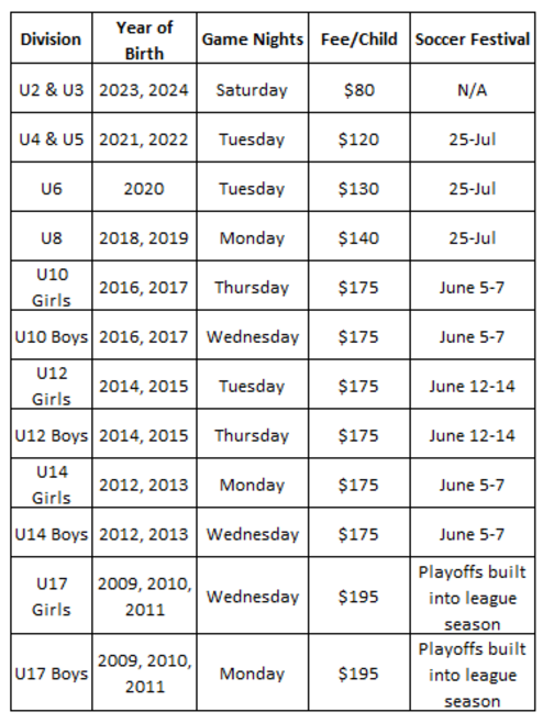 PLEASE NOTE THAT GAME TIMES AND PRACTICE DATES/TIMES ARE NOT SET UNTIL AFTER TEAMS HAVE BEEN DRAFTED IN MID APRIL.